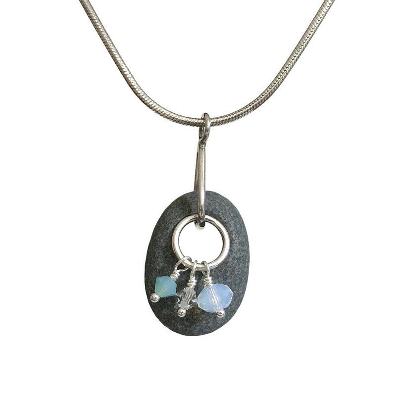 Handcrafted with Sterling Silver and authentic beach stone collected from Nova Scotia, this pendant is the perfect way to capture the fresh, breezy, and tranquil elements of the coastline. Feel connected to the ocean's beauty when you wear this unique piece of jewelry.